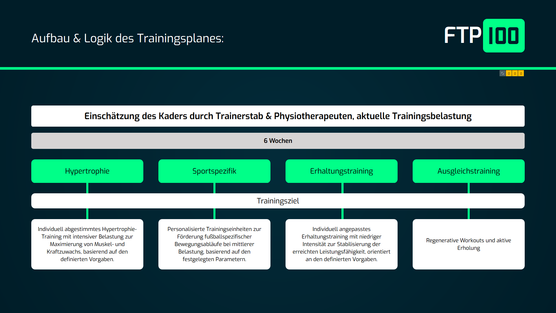 Mit einem umfassenden ganzjährigen Programm, das in mehrere spezifische Phasen unterteilt ist und kategorisch auf die Schwächen und Stärken des Trainierenden angepasst wird, führt der FTP100 jeden Fussballer durch eine gezielte Entwicklung, von der Grundlagenbildung bis hin zur Feinabstimmung der Fähigkeiten.